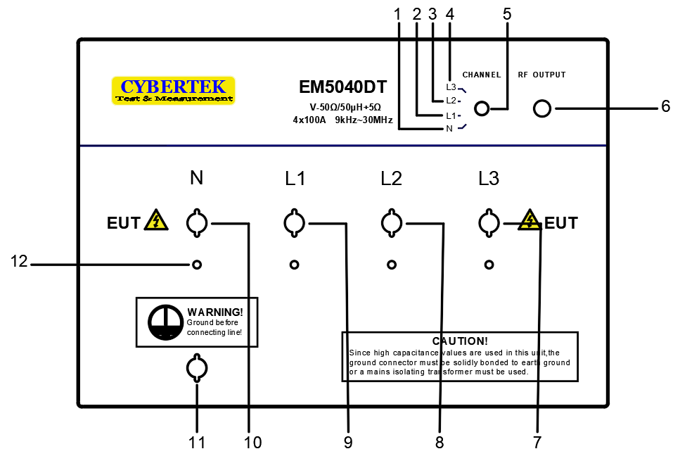 10(被測設(shè)備(EUT))供電接口:N 相被測設(shè)備電源接口,該螺栓尺寸為 10mm。