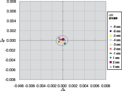 即使同一批次的LED背光的發(fā)光輻射曲線,也會經(jīng)常有所不同,在其波峰處約有10nm左右的偏移現(xiàn)象。如果使用傳統(tǒng)的色彩分析儀來測量調(diào)整這種特性屏幕的白平衡,在xy色度上引起的誤差可能要接近0.010左右。但如果使用CA-310,同樣條件下的色度誤差會減小到0.003左右,約為原來的1/3,大大提高了測量精度和穩(wěn)定性。