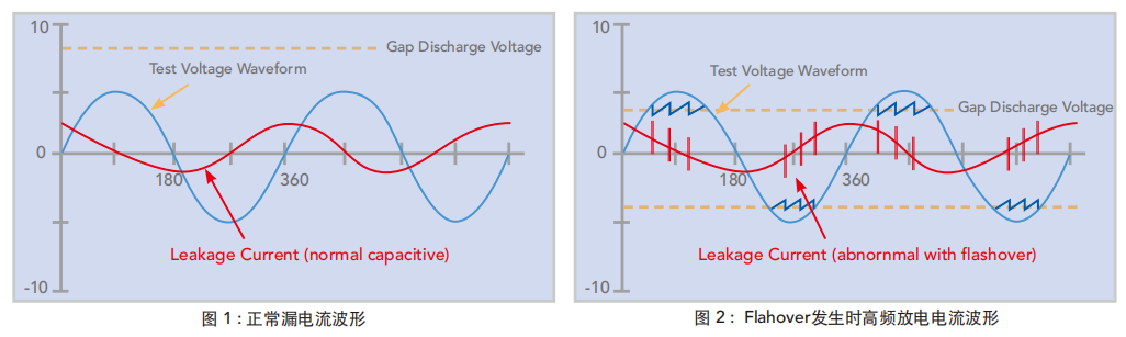 19070&19050系列與Chroma其它安規(guī)測(cè)試系列儀器同樣具有Flashover偵測(cè)功能。Flashover是絕緣材料內(nèi)部或表面因高電界產(chǎn)生電氣放電,待測(cè)物失去原有之絕緣特性,形成瞬時(shí)或非連續(xù)性放電,導(dǎo)致碳化導(dǎo)電渠道產(chǎn)生或產(chǎn)品傷害。若只以漏電流判定則無(wú)法檢出不良,須以測(cè)試電壓或漏電流之變化率判定檢出不良。因此Flashover偵測(cè)為高壓測(cè)試不可或缺的檢視項(xiàng)目之一。