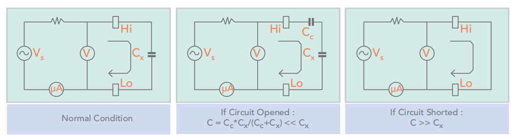 OSC功能為偵測(cè)測(cè)試過(guò)程中是否有開(kāi)路(接觸不良)或短路(待測(cè)物短路)的情形發(fā)生,測(cè)試過(guò)程中若發(fā)生開(kāi)路現(xiàn)象,會(huì)導(dǎo)致不良品誤判為良品;若發(fā)生短路現(xiàn)象,可提早得知并篩選,減少對(duì)治具設(shè)備的傷害,節(jié)省測(cè)試成本。一般耐壓測(cè)試產(chǎn)品皆呈電容性(Cx),在正常狀態(tài)下可能在數(shù)十pF至數(shù)μF之間。一旦發(fā)生連接斷路則會(huì)在斷路界面形成微小電容量(圖2之Cc),一般低于10pF,而呈現(xiàn)整體電容量遠(yuǎn)低于正常產(chǎn)品現(xiàn)象。而當(dāng)待測(cè)物短路或接近短路時(shí)時(shí)則會(huì)呈現(xiàn)電容量遠(yuǎn)高于正常現(xiàn)象。因此可利用電容量變化之上下限值判定出短路問(wèn)題。