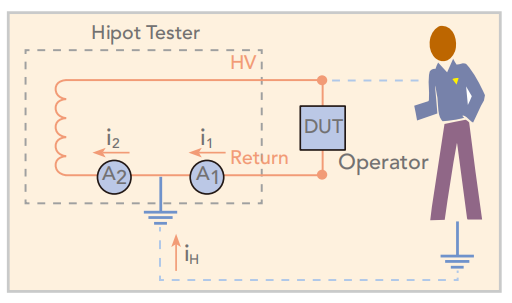 安規(guī)測(cè)試的目的是為了保護(hù)產(chǎn)品使用者的安全。Chroma 19070及19050系列擁有GFI人體保護(hù)功能來(lái)保護(hù)測(cè)試人員。在突發(fā)人體感電的情形下,GFI能夠立即切斷儀器之電壓輸出,保護(hù)操作員不受電氣傷害。GFI功能以偵測(cè)從地端(Earth GND)流回之電流(iH)與RETURN端電流(i1),比較后若大于0.5mA,則會(huì)在立即切斷電壓輸出。