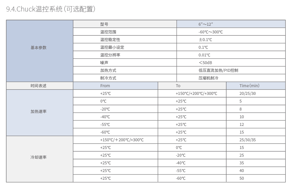 ● 高效的CHUCK測試系統(tǒng)運(yùn)行速度≥70mm/s,運(yùn)動精度≤1μm,同時移動轉(zhuǎn)位時間index time≤500ms,優(yōu)異的系統(tǒng)運(yùn)行參數(shù)已達(dá)到領(lǐng)先水平,高測試精度和效率滿足各類晶圓和器件的高重復(fù)性與穩(wěn)定性測試測試效率有效提升40%以上;●優(yōu)于± 0.08℃的溫控精度和穩(wěn)定性,提供高低溫環(huán)境下的可靠性晶圓測試;●四維運(yùn)動低重心緊湊結(jié)構(gòu)設(shè)計,確保70mm/s的運(yùn)動速率的同時保持運(yùn)動加減速的穩(wěn)定性。