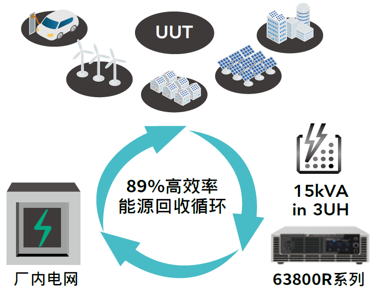63800R系列可提供用戶完善的節(jié)能方案,透過(guò)其能源回收機(jī)制,被測(cè)物在拉載測(cè)試中所消耗的能量可高效率經(jīng)由機(jī)器回饋到電網(wǎng),而不是在測(cè)試過(guò)程以熱能消耗,達(dá)成環(huán)保節(jié)能的目的。借此,63800R系列可適用于市面上各項(xiàng)綠能相關(guān)產(chǎn)業(yè)測(cè)試,如儲(chǔ)能系統(tǒng)ESS、混合型太陽(yáng)能逆變器(Hybrid PV Inverter)、電動(dòng)車交流充電設(shè)備(AC EVSE),以及雙向車載充電器(BOBC)的V2L、V2H應(yīng)用等。