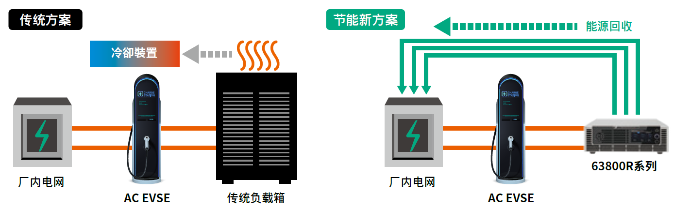 63800R系列能源回收式交流電子負(fù)載藉由高功率密度和高效率能源回收等特性,在測(cè)試領(lǐng)域提供交流電動(dòng)車充電樁(AC EVSE)全新的節(jié)能省碳方案。傳統(tǒng)使用的負(fù)載箱不僅體積龐大,更因?yàn)閷y(cè)試能量轉(zhuǎn)為熱能,造成大量能源耗費(fèi),同時(shí)須配置對(duì)應(yīng)的置冷系統(tǒng)來(lái)避免環(huán)境過(guò)熱,而Chroma 63800R系列具備最高89%效率之能源回收功能,以使用滿功率拉載為例,一臺(tái)設(shè)備每年可替產(chǎn)線節(jié)省116,946kWh的電力,相當(dāng)於45,258kg的碳排放量,除了達(dá)到節(jié)能目的之外,亦可大幅縮減置冷成本,且3U高機(jī)身對(duì)比龐大笨重的負(fù)載箱,可帶來(lái)更彈性的測(cè)試配置。此外,Chroma 63800R系列配備完整的CC、CP、CR拉載模式,符合AC EVSE的CCID/RCD漏電流要求標(biāo)準(zhǔn),可提供更經(jīng)濟(jì)且可靠的老化測(cè)試、拉載特性測(cè)試之解決方案。