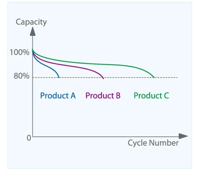 電池之充放電使用壽命不只是動(dòng)力電池需要,所有電池芯產(chǎn)品都有 相同之測(cè)試條件,其測(cè)試是依照評(píng)估者先行定義的充放電條件做為 一個(gè)周期,反復(fù)測(cè)試同一顆電池芯,評(píng)估此電池直到測(cè)試終止條件 到達(dá)前,正確地執(zhí)行過(guò)幾個(gè)周期,即為此電池之循環(huán)周期,而循環(huán) 周期次數(shù)愈多,代表此電池芯之壽命愈長(zhǎng)。進(jìn)而以同樣測(cè)試條件測(cè) 試不同種類的電池芯,來(lái)評(píng)估性能優(yōu)劣,或用來(lái)評(píng)估某一產(chǎn)品最適 合的充放電條件與使用條件。