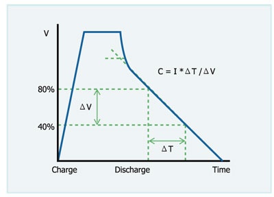 根據(jù)EDLC測(cè)試法規(guī)IEC 62391,在測(cè)試容量前,EDLC必需確定其 經(jīng)過(guò)CV充電程序并且已經(jīng)完成充電后,其容量測(cè)試是以上述放 電電流進(jìn)行CC放電,放電程序完成后,取放電曲線上EDLC之額 定電壓的80%電壓點(diǎn)及額定電壓的40%電壓點(diǎn),二點(diǎn)間的放電能 量與間距時(shí)間,來(lái)計(jì)算此EDLC的容量。